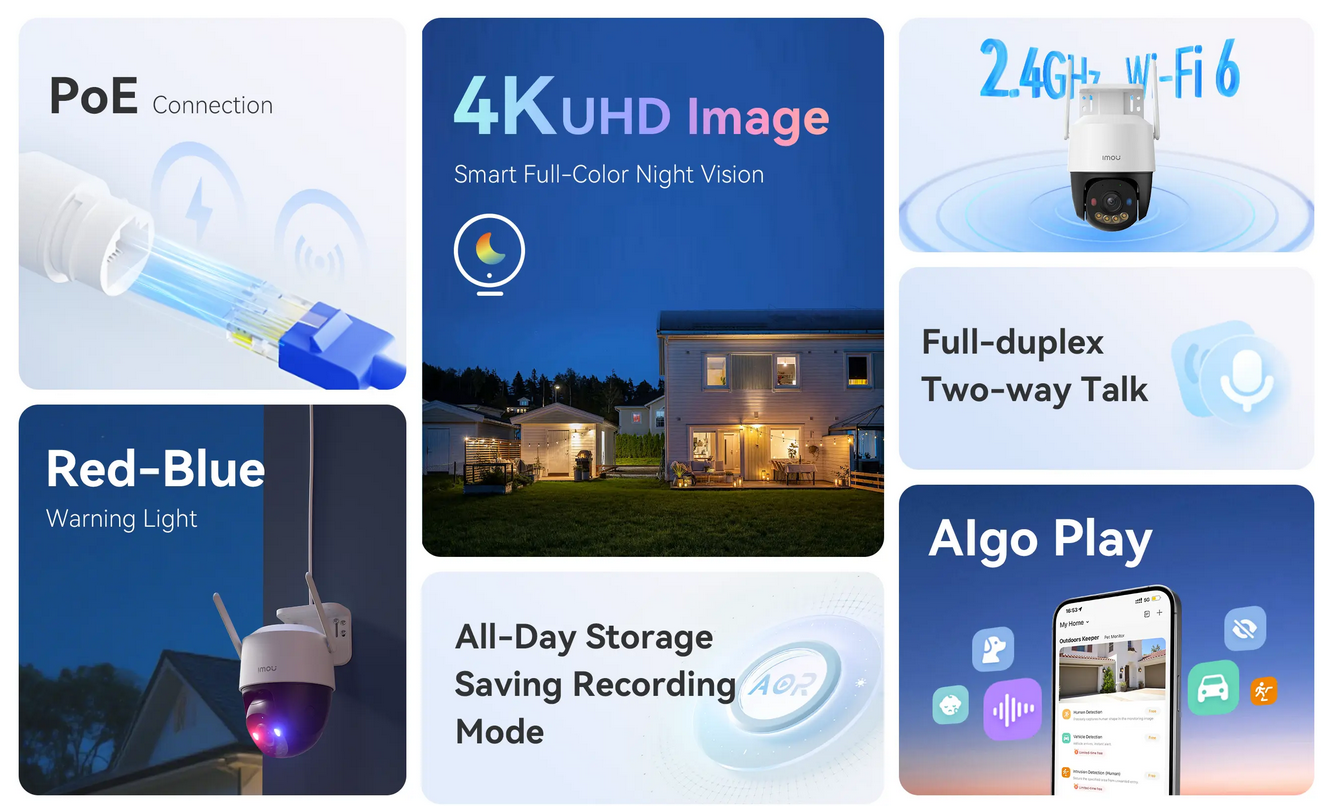 8MP progressive CMOS senzor,Wi-Fi 6:IEEE802.11b/g/n/ax, Main stream frame rate:- 15 fps @ 3840×2160-8MP , LED domet do 30m, H.265&H.264. Mikrofon i zvučnik ugrađeni crveno plavo svijetlo, Two-way talk, Micro SD Max 512GB, Detekcija pokreta, Detekcija ljudi,Detekcija vozila,Upad u sticeni prostor i prelazak preko linije, Podesiva regija, Smart Tracking,IP66 zaštita, DC12V Max 12W (adapter 12V 1A dolazi uz kameru). Podržava Android i IOS: besplatna aplikacija IMOU