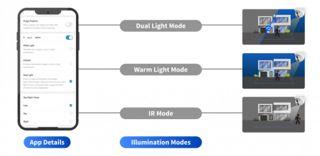 Tokom noći, kada nema događaja, topla svjetlost IP kamere pruža minimalnu nivo osvetljenja. Kada se detektuju događaji, osvetljenje se odmah pojačava, čime se poboljšava vidljivost i omogućava jasnija slika. Kada objekat napusti nadgledanu zonu, svjetlost se elegantno smanjuje na prethodni blagi nivo.