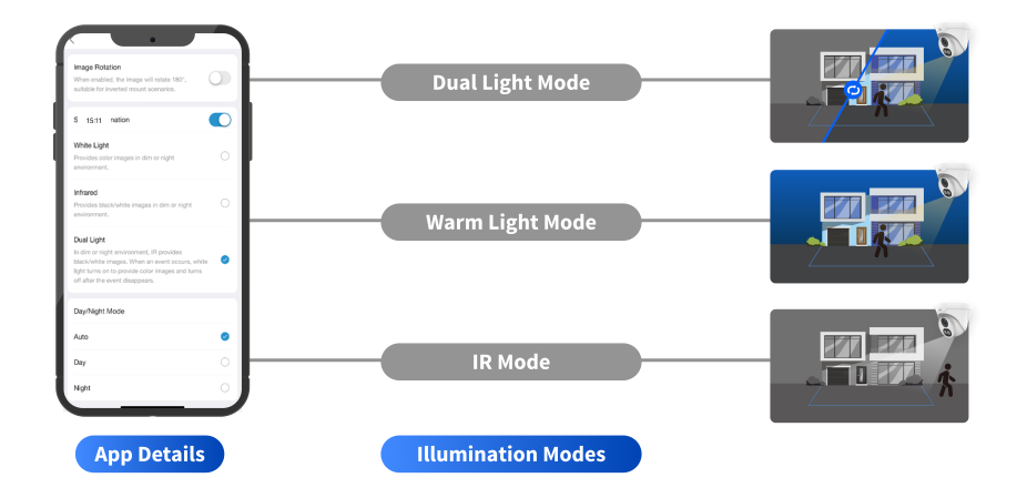 Tokom noći, kada nema događaja, topla svjetlost IP kamere pruža minimalnu nivo osvetljenja. Kada se detektuju događaji, osvetljenje se odmah pojačava, čime se poboljšava vidljivost i omogućava jasnija slika. Kada objekat napusti nadgledanu zonu, svjetlost se elegantno smanjuje na prethodni blagi nivo.