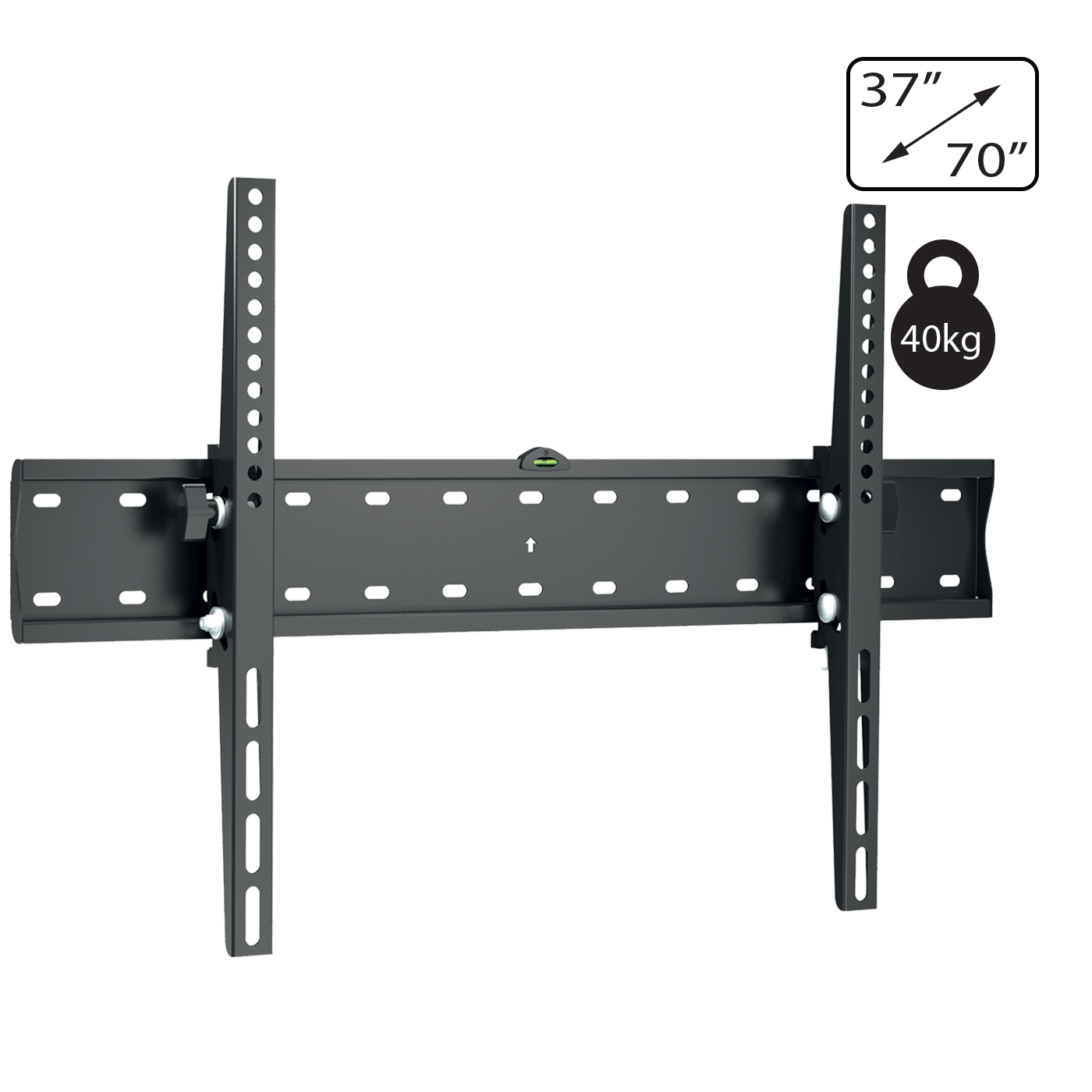 Zidni nosač za TV prijemnike 37″ – 70″, maximalno opterećenja 40 kg, VESA 200 x 200, 400 x 200, 300 x 300, 400 x 400, 600 x 400 mm, nagib +/-12°, jednostavna montaža, fiksno pozicioniranje, zaključavanje i brzo otpuštanje. Pakiranje: set vijaka za montažu, libela i upute za uporabu. Boja crna