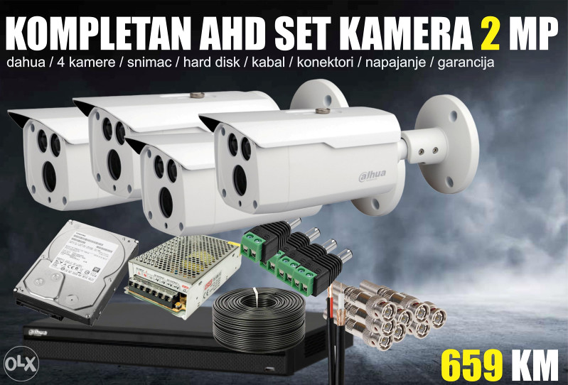 U kompletu se nalazi Full HD (1080p) kamera oblika bullete. Kamera poseduje BLC, 2D DNR, DWDR kao i inteligentnu IR rasvetu dometa do 20 m (Smart IR). Ukoliko Vam je potrebna dome kamera umjesto Bullet u ovom setu je možemo zamijeniti ako to naglasite.
